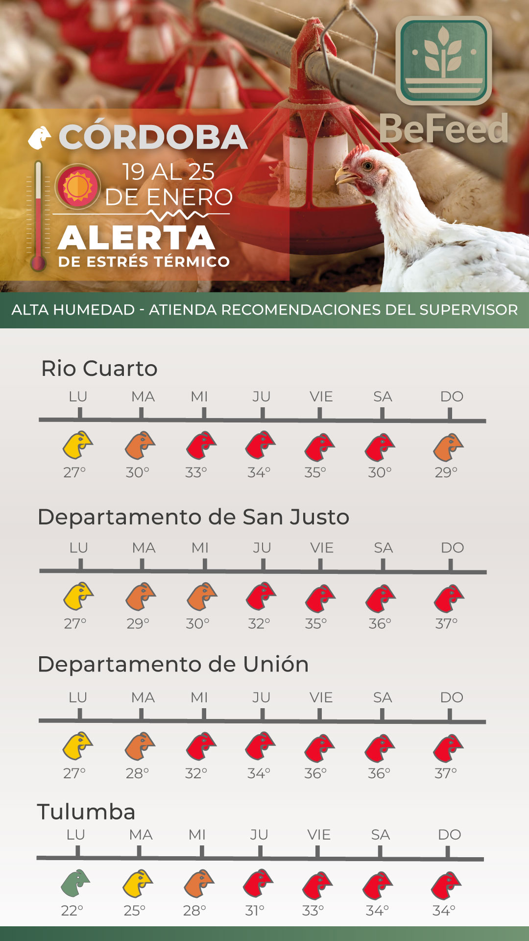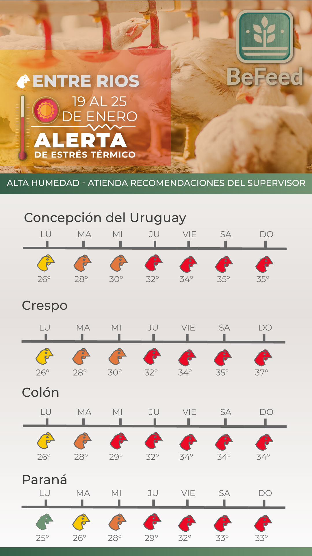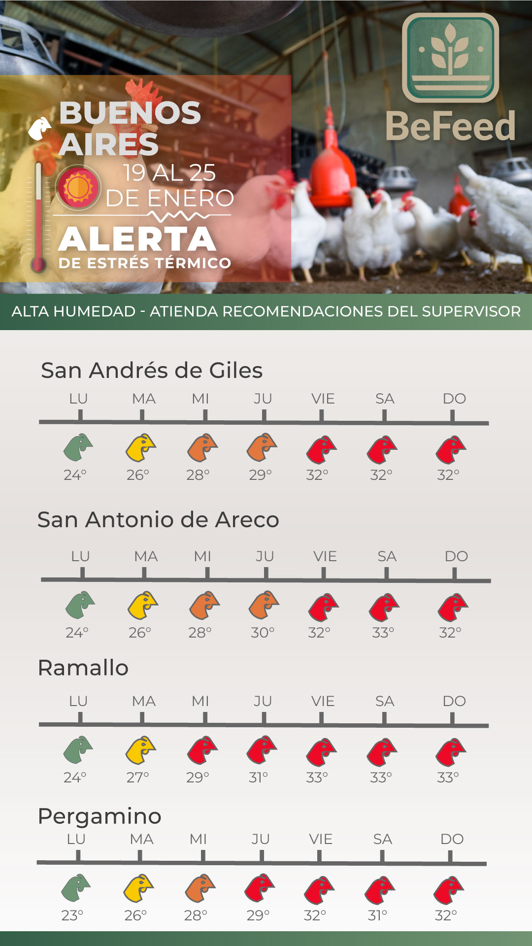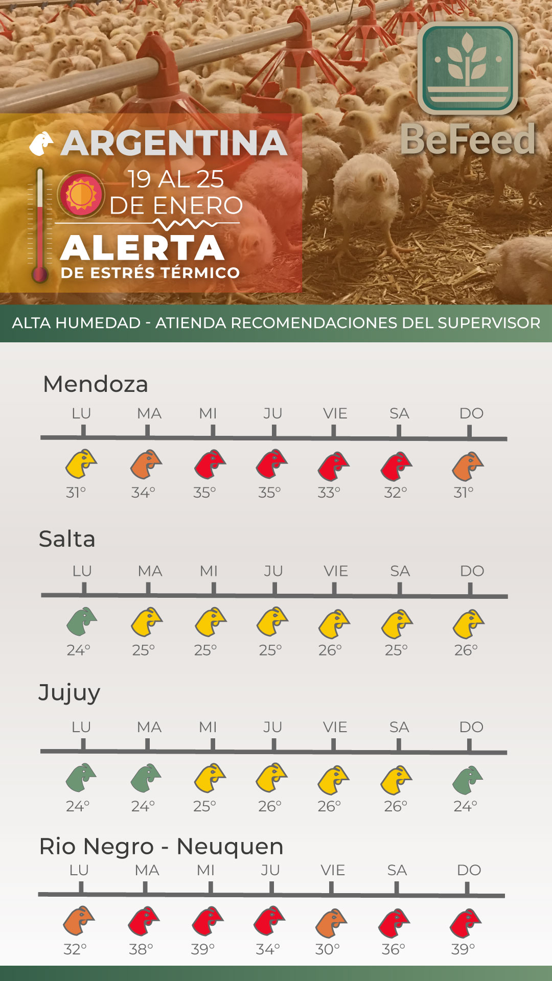 Desde BeFeed, están promoviendo herramientas específicas como semáforos de alerta basados en el ITH. “Vamos planteando en función de la ola de calor, el cálculo del ITH, lo que son banderas verdes, amarillas y rojas”, explicó Lencioni. Estas herramientas permiten tanto a productores como a distribuidores actuar de manera proactiva, con información certera que ayuda a reducir los efectos adversos del estrés térmico.
