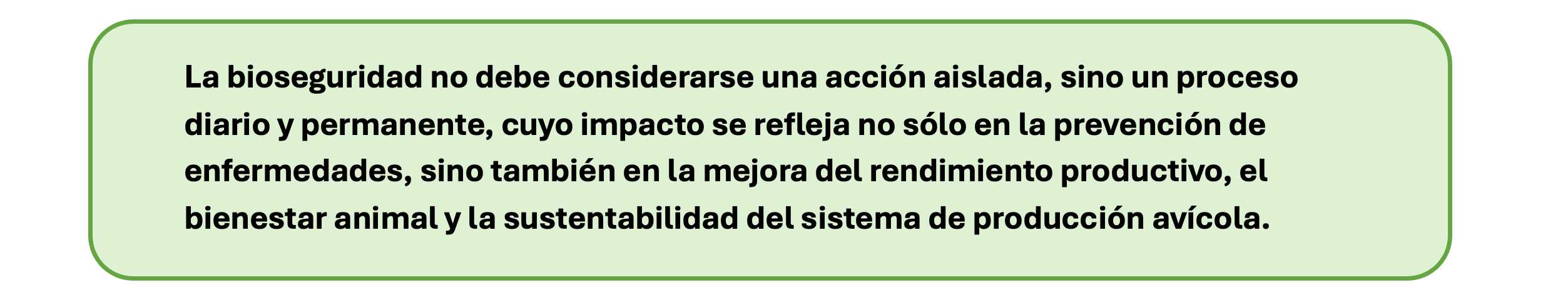 La bioseguridad constituye un pilar fundamental en la producción avícola, especialmente en sistemas de postura comercial, donde la alta densidad animal incrementa el riesgo sanitario. La correcta aplicación de medidas de bioseguridad externa e interna, junto con protocolos estrictos de limpieza, desinfección y su monitoreo, permite reducir significativamente la probabilidad de ingreso y diseminación de agentes infecciosos. Asimismo, la capacitación continua del personal y el cumplimiento riguroso de los procedimientos establecidos son factores determinantes para el éxito del programa.