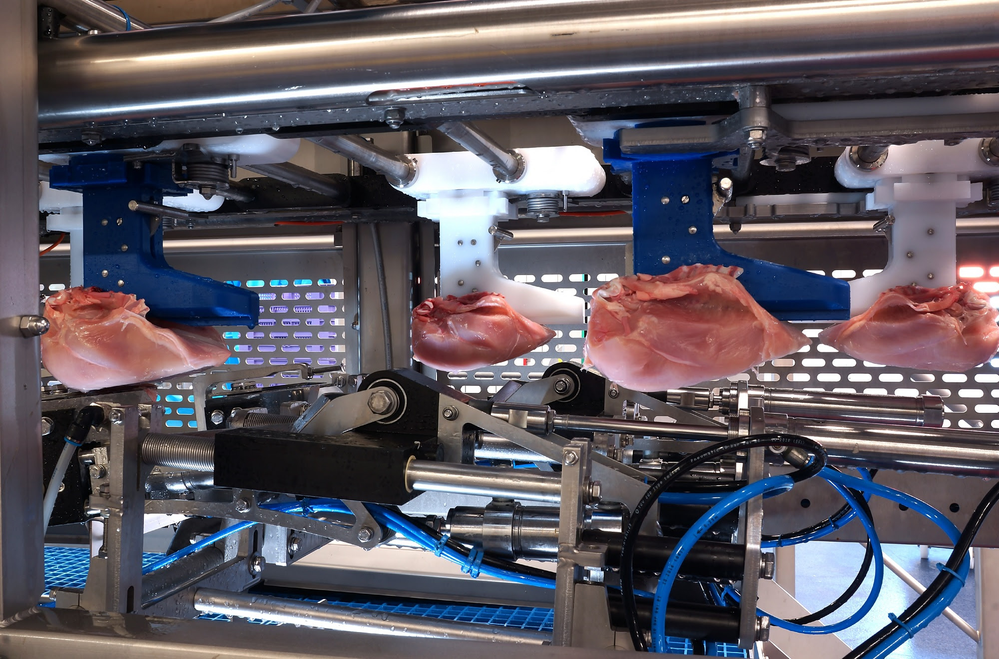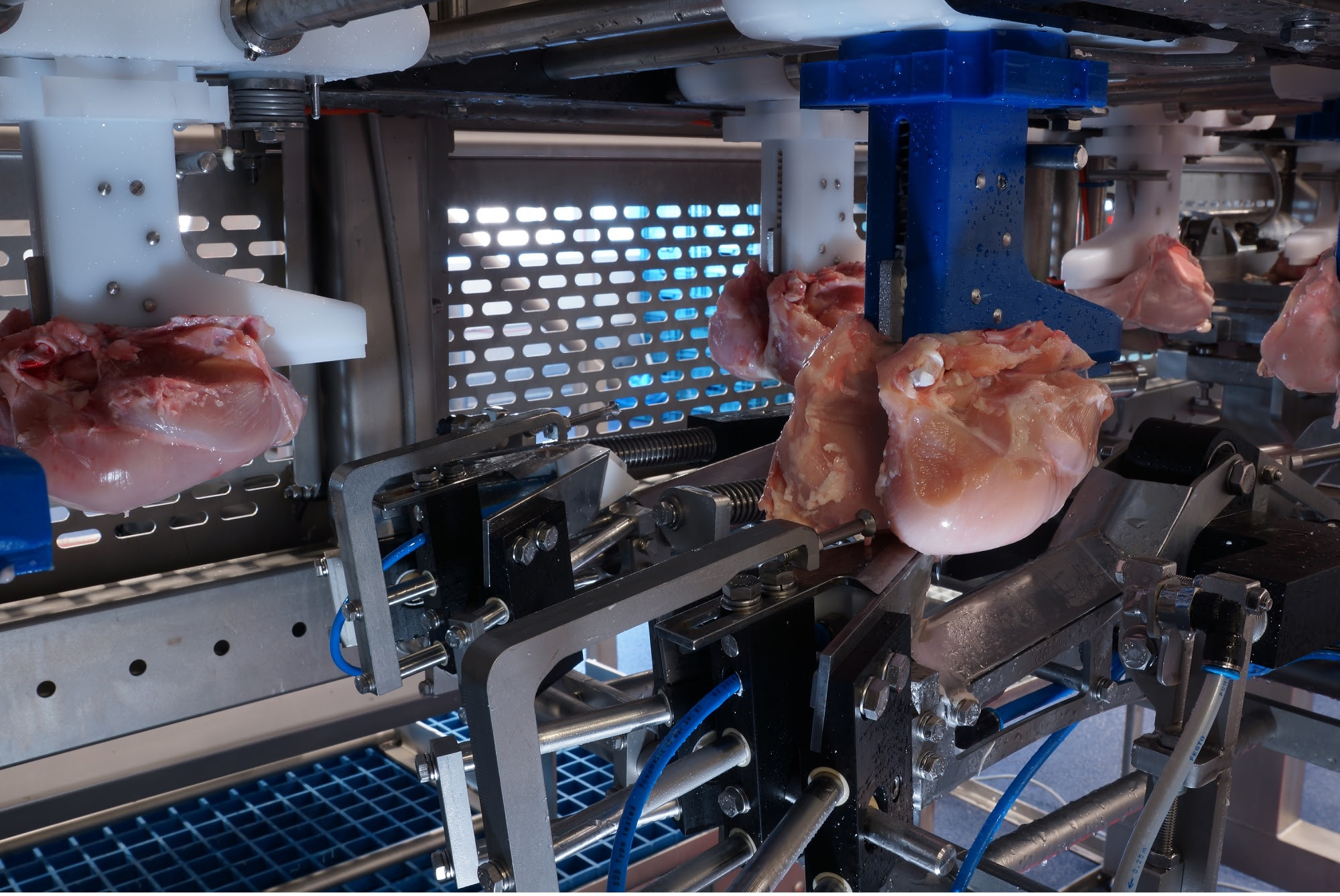 La máquina permite trabajar tanto con pechugas breast cap como front half con un simple cambio de soportes.